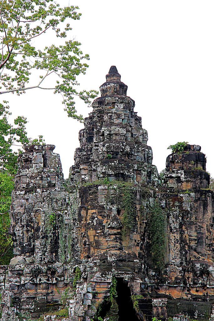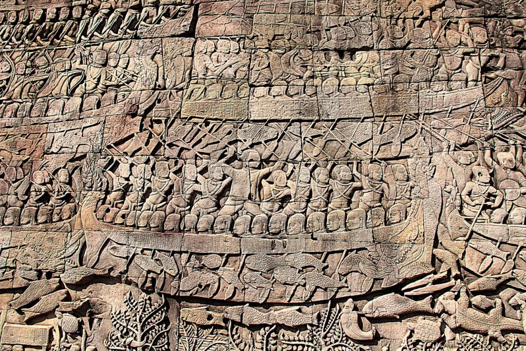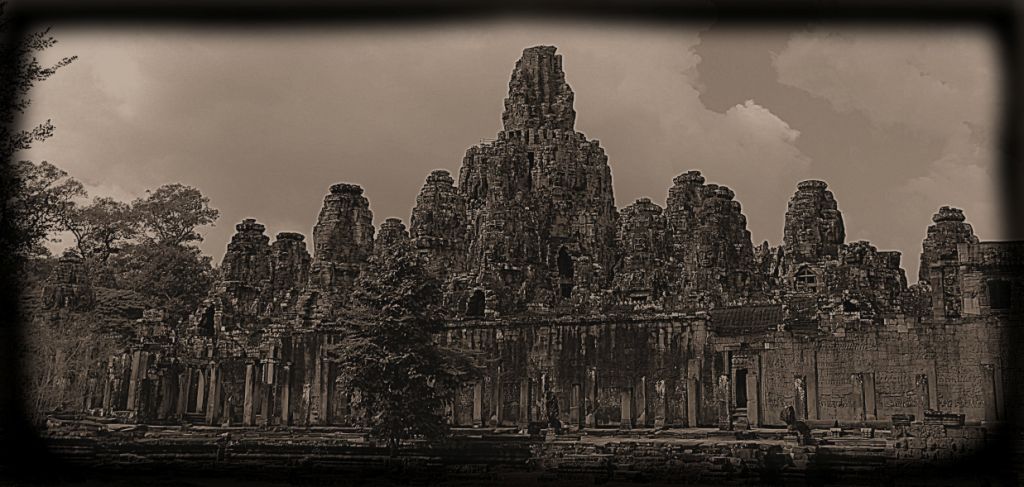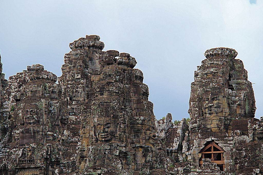 The Bayon is a richly decorated Khmer temple, built in the late 12th or early 13th century as the official state temple of the Mahayana Buddhist King Jayavarman VII. The Bayon stands at the centre of Jayavarman’s capital, Angkor Thom. Following Jayavarman’s death, it was modified and augmented by later Hindu and Theravada Buddhist kings in accordance with their own religious preferences. The Bayon’s most distinctive feature is the multitude of serene and massive stone faces on the many towers which jut out from the upper terrace and cluster around its central peak. The temple is also known for two impressive sets of bas-reliefs, which present an unusual combination of mythological, historical, and mundane scenes.