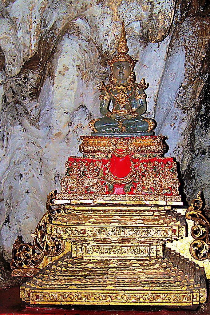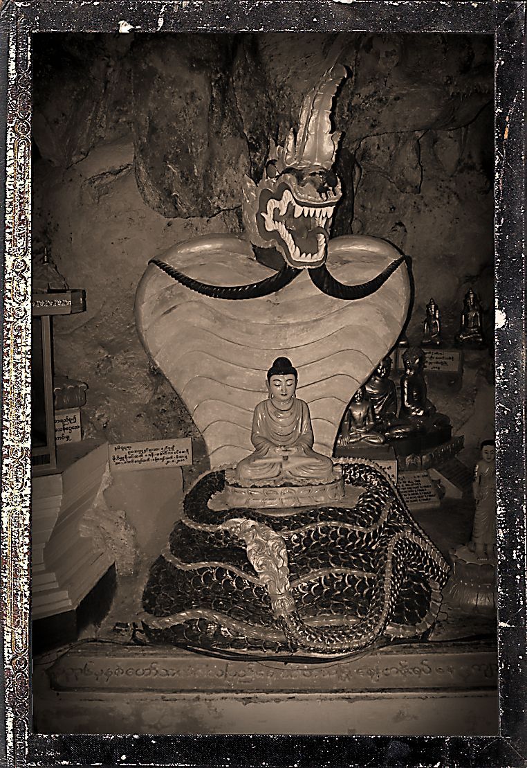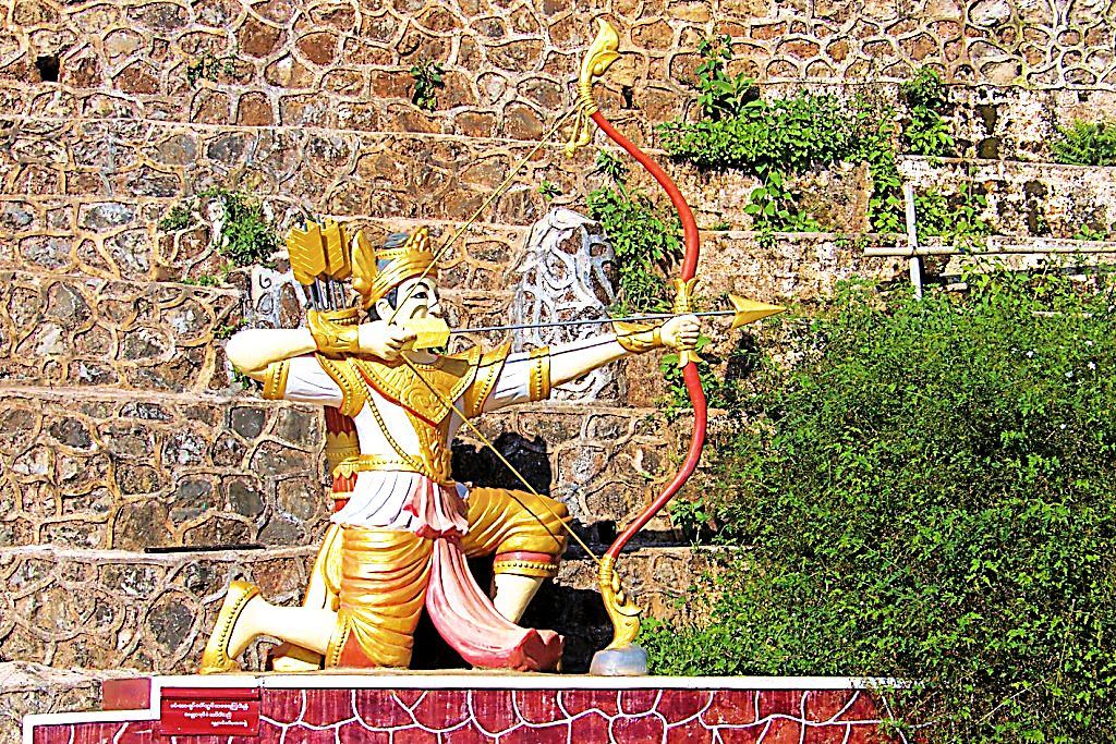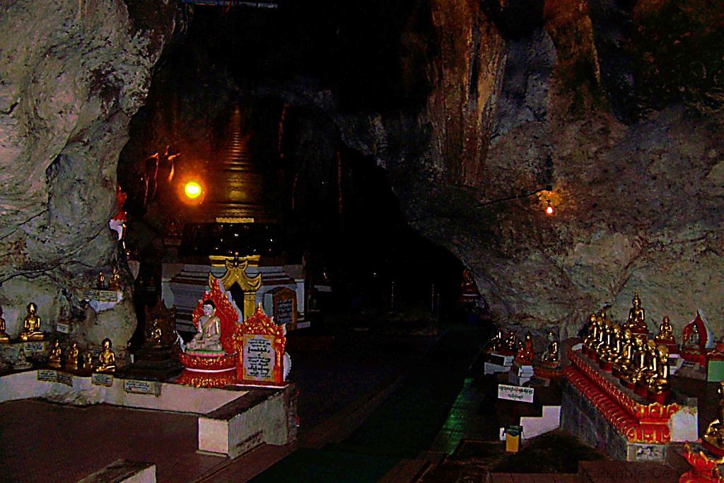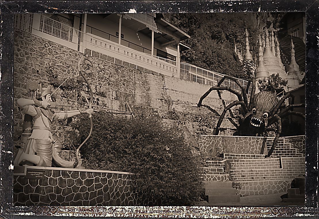 There are many legends surrounding the Pindaya cave. One is that a blocked-off path at the end of the cave leads to the ancient city of Bagan. There is also the legend of the seven princesses bathing in a lake and how they were captured by a giant spider and trapped in the cave to be rescued by Prince Kummabhaya of Yawnghwe. Sculptures of the spider and the prince aiming with his bow and arrow have been added in recent times at the entrance of the covered stairway to the caves. Shwe U Min (Golden Cave) Pagoda is 15m high and is situated at the entrance of the southernmost cave. That cave is known for its interior which contains over 8,000 images of Buddha. Although most statues are of late 18th and early 19th century, many other statues and images have been placed there on an on-going basis by different donors throughout the cave’s history up until the present time.