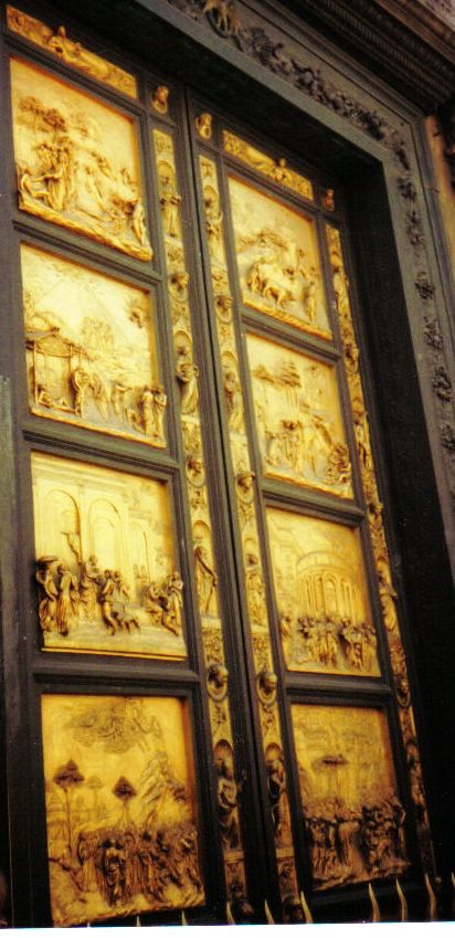 The Florence Baptistery (Battistero di San Giovanni), also known as the Baptistry of Saint John, is one of the oldest buildings in the city, constructed between 1059 and 1128. The Baptistry is renowned for its three sets of bronze doors with relief sculptures. The south doors were done by Andrea Pisano and the north and east doors by Lorenzo Ghiberti. The east doors were dubbed by Michelangelo the Gates of Paradise. The Italian poet Dante and many other notable Renaissance figures, including members of the Medici family, were baptized in this baptistry.