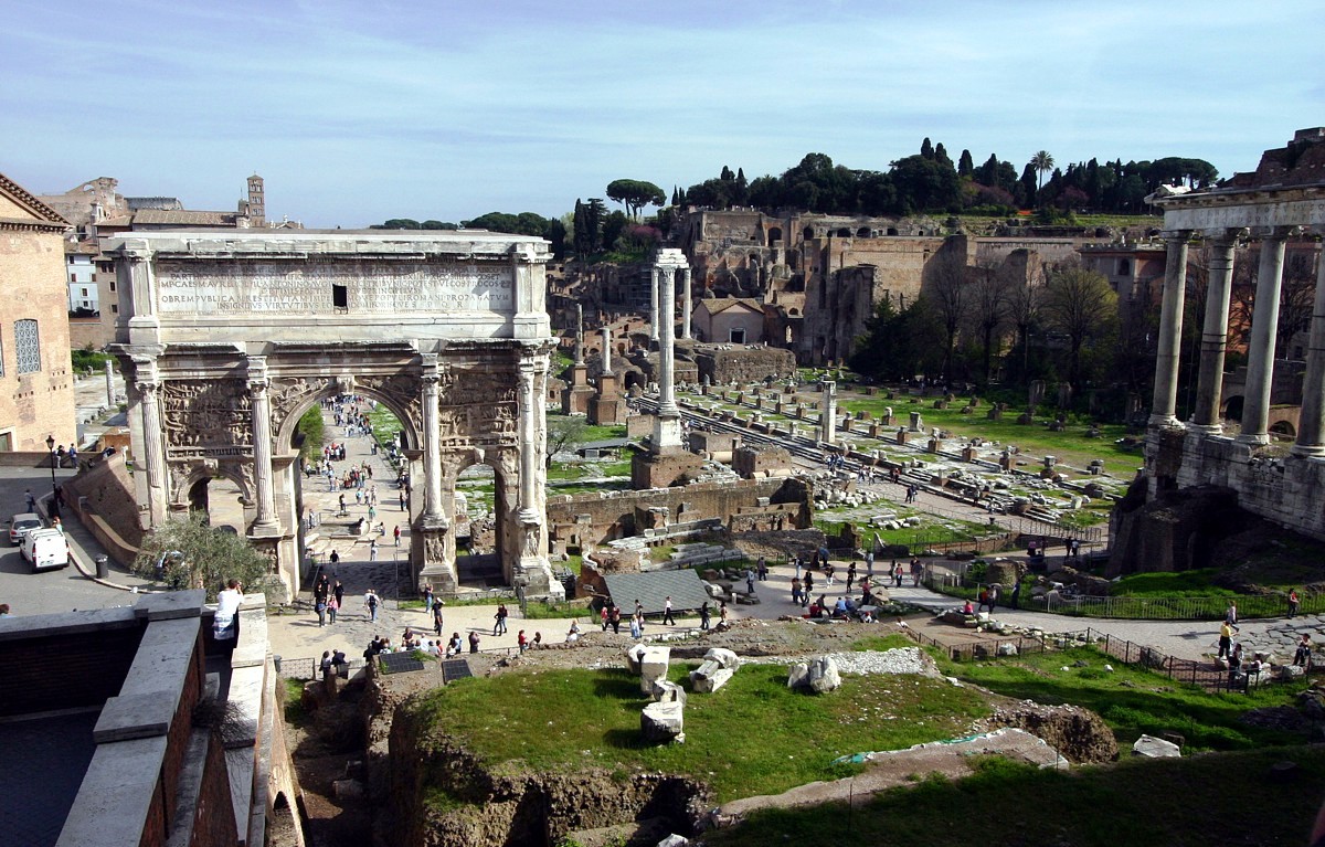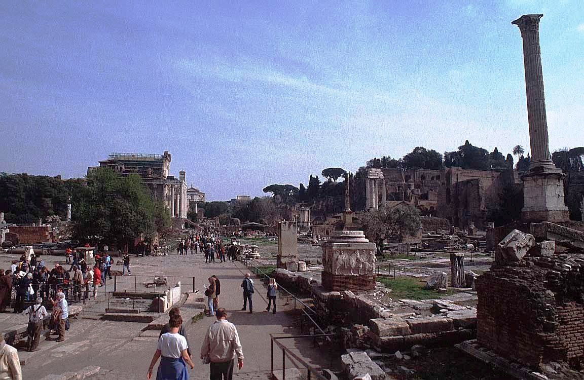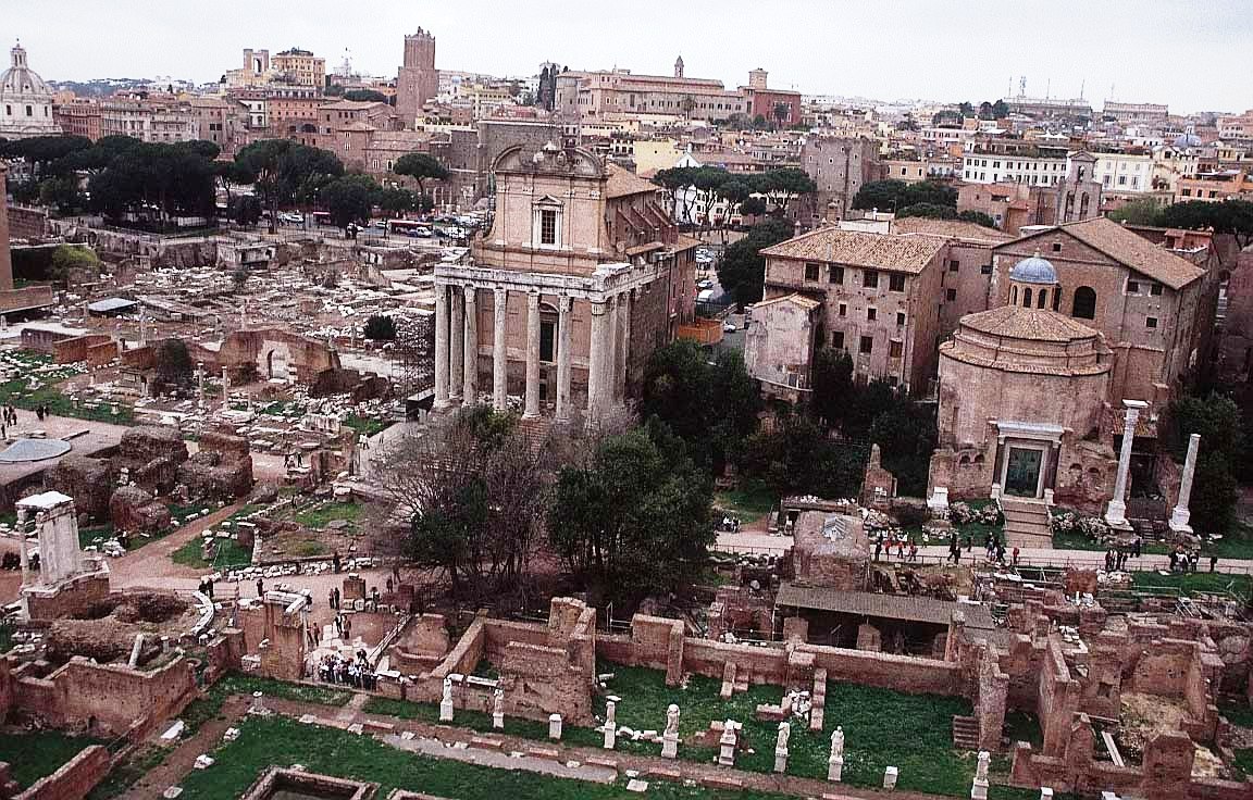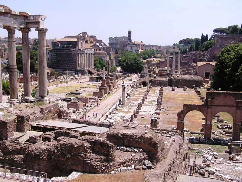The Forum Romanum is a rectangular plaza surrounded by the ruins of several important ancient government buildings at the center of the city of Rome. Citizens of the ancient city referred to this space, originally a marketplace, as the Forum Magnum, or simply the Forum. It was for centuries the center of Roman public life: the site of triumphal processions and elections, the venue for public speeches, criminal trials, and gladiatorial matches; and the nucleus of commercial affairs.