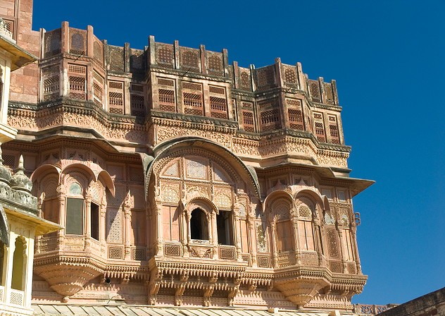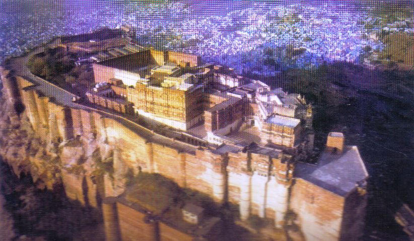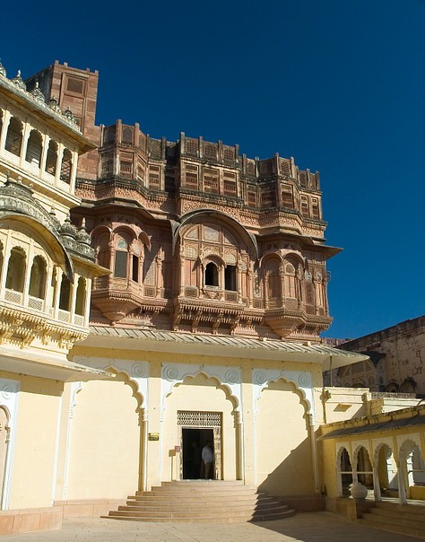 The fort is situated 122 m above the city and is enclosed by imposing thick walls. Inside its boundaries there are several palaces known for their intricate carvings and expansive courtyards. The imprints of cannonball hits by attacking armies of Jaipur can still be seen on the second gate. Though the building of the fortress was originally started in 1459 by Rao Jodha, founder of Jodhpur, most of the fort which stands today dates from the period of Jaswant Singh (1638–78).