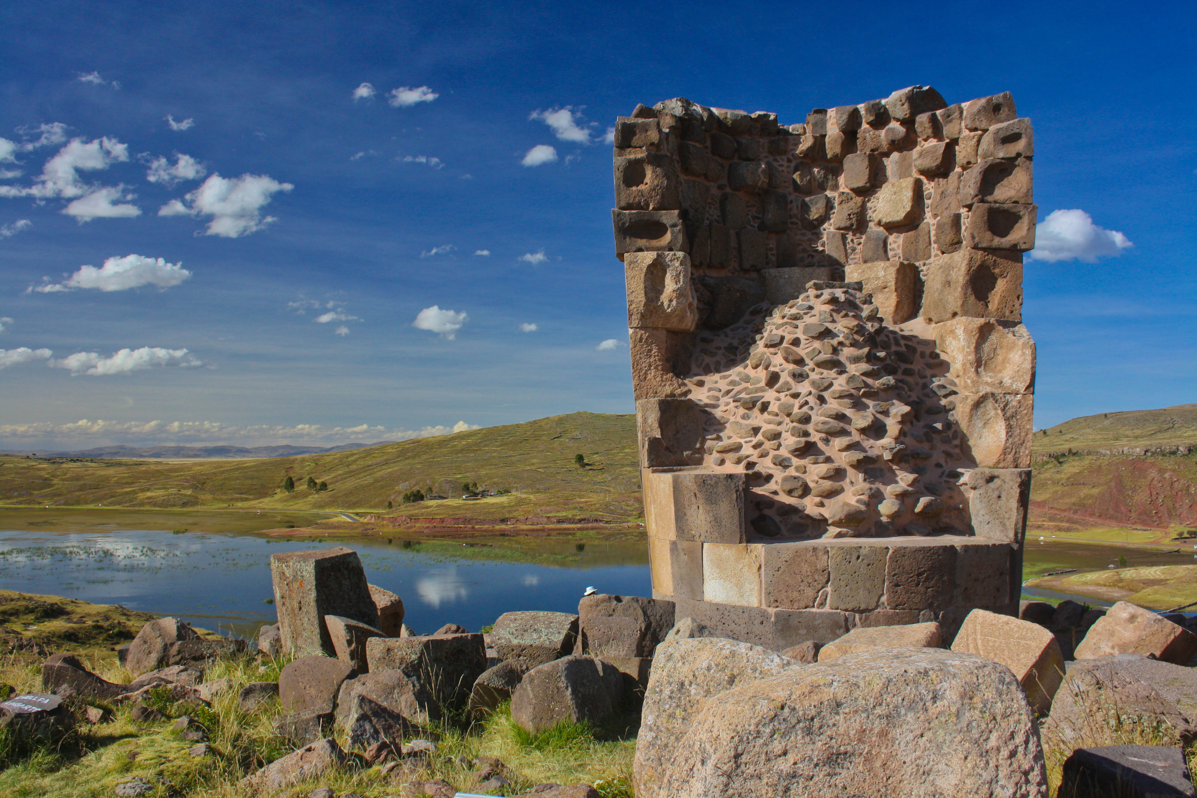Sillustani is a pre-Incan burial ground on the shores of Lake Umayo near Puno in Peru. The tombs, which are built above ground in tower-like structures called chullpas, are the vestiges of the Colla people who were conquered by the Inca in the 15th century. The structures housed the remains of complete family groups, although they were probably limited to nobility. Many of the tombs have been dynamited by grave robbers, while others were left unfinished.