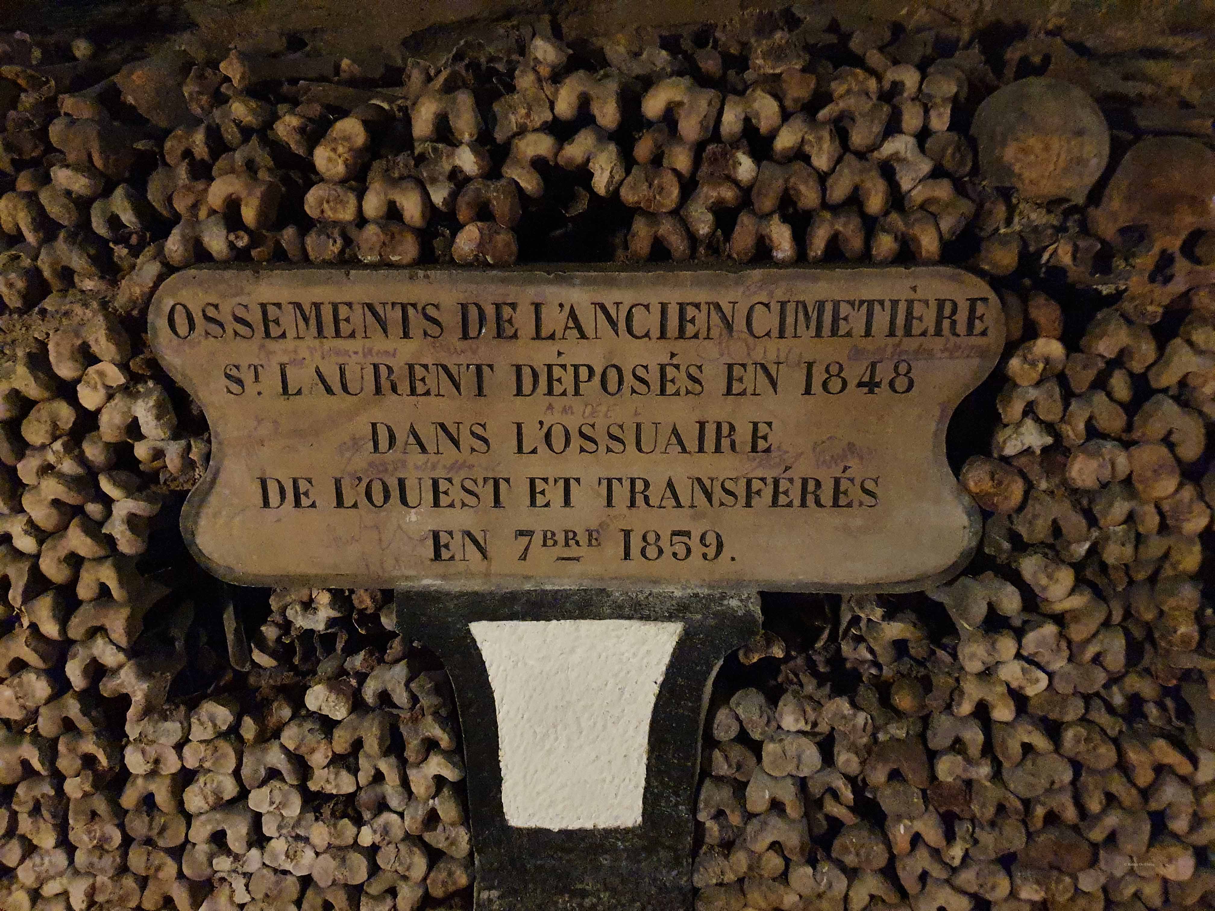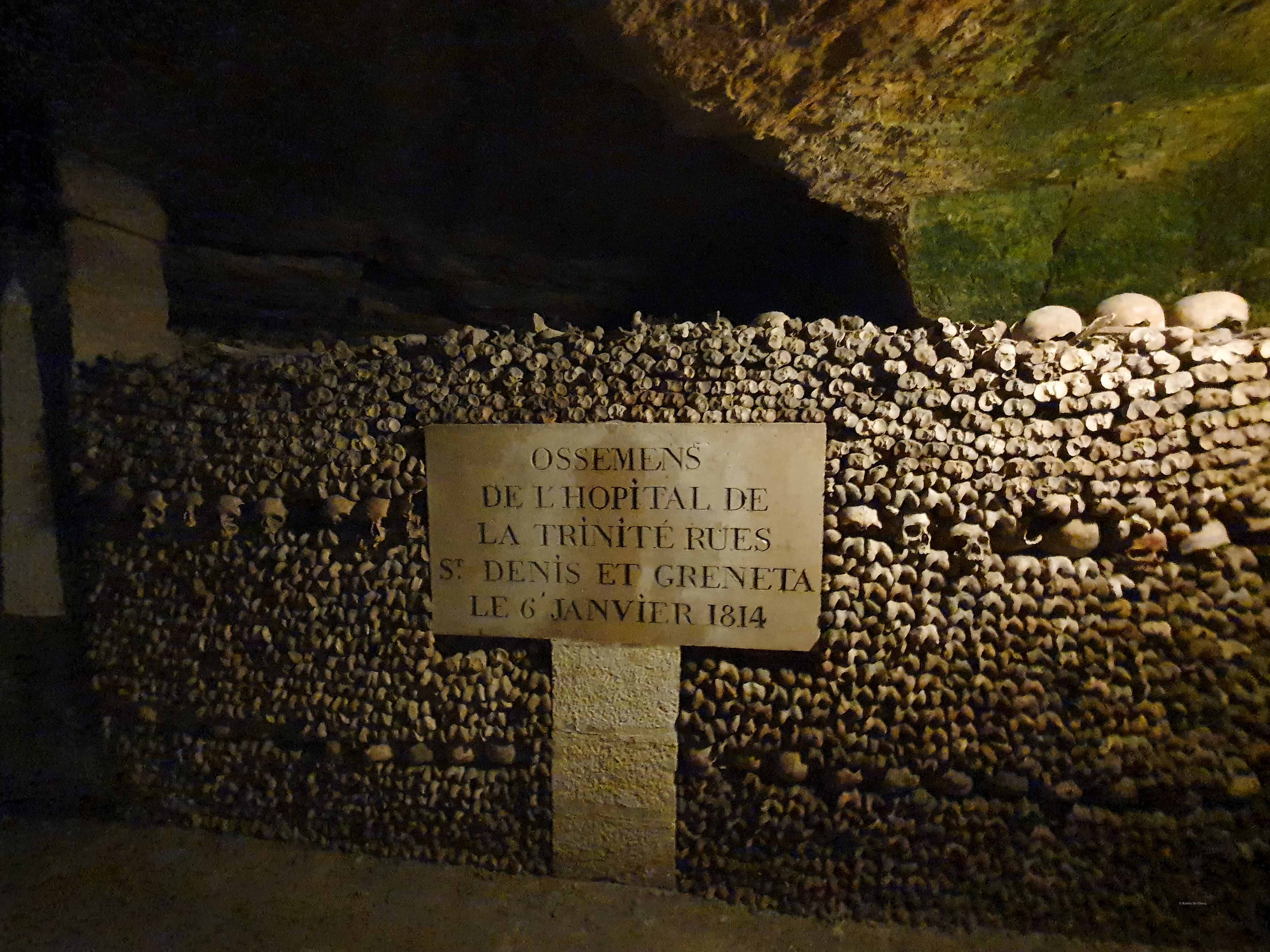 Onder Parijs is een groot netwerk te vinden van ondergrondse tunnels van minstens 290 km lang. Oorspronkelijk waren deze tunnels de kalksteengroeven van Montrouge. Uit deze kalksteengroeven werd gedurende eeuwen het steen gehaald waarmee de gebouwen van Parijs zijn gebouwd. Vanaf 1785 tot ver in de 19e eeuw is een deel van de kalksteengroeven gebruikt als depot om de beenderen van de overvolle kerkhoven in onder te brengen. Zo werd in 1780 als eerste het Cimetière des Innocents (indertijd de enige begraafplaats binnen de muren van Parijs) gesloten. Alle rond de twee miljoen botten werden vanaf 1785 overgebracht naar de steengroeven onder de stad. Ook andere Parijse begraafplaatsen werden wegens gezondheidsredenen geruimd. In totaal liggen de botten van ongeveer zes miljoen mensen in de catacomben begraven. Deze menselijke resten werden in lege kamers gestort en afgedekt met een netjes gestapelde wand van schedels en botten. Met plaquettes wordt aangegeven van welke begraafplaats de botten afkomstig zijn.