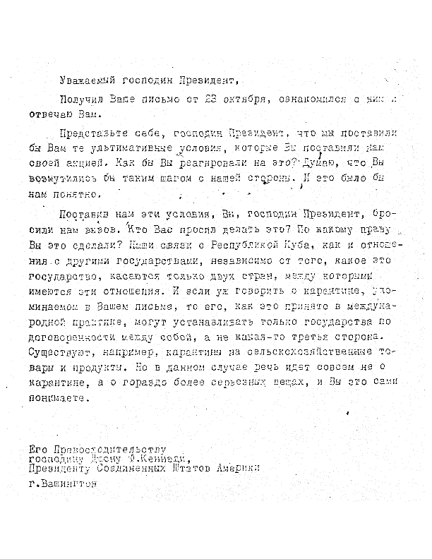 Chroesjtsjov heeft het bericht 10 uur eerder al geschreven, maar alle communicatie tussen het Kremlin en het Witte Huis verloopt via een oude en onbetrouwbare telex. In het begin van de jaren 1960 hebben de VS en de Sovjet-Unie geen enkele mogelijkheid om direct met elkaar te communiceren. Berichten worden verzonden via verschillende tussenstations. In zijn lange bericht beschrijft de Sovjetleider de Amerikaanse blokkade als ‘middeleeuwse piratenpraktijken’. Bovendien zijn de Amerikanen te laat: ‘De wapens die nodig zijn om Cuba te verdedigen, zijn er al,’ schrijft Chroesjtsjov, en hij beschuldigt de VS ervan dat ze ‘dreigen met oorlog’. Chroesjtsjov eist dat de VS hun vloot terugtrekken en beloven Cuba niet aan te vallen. Als de Amerikanen aanvallen, is Moskou gedwongen om te reageren: ‘Als er oorlog uitbreekt, kunnen we die niet meer stoppen.’