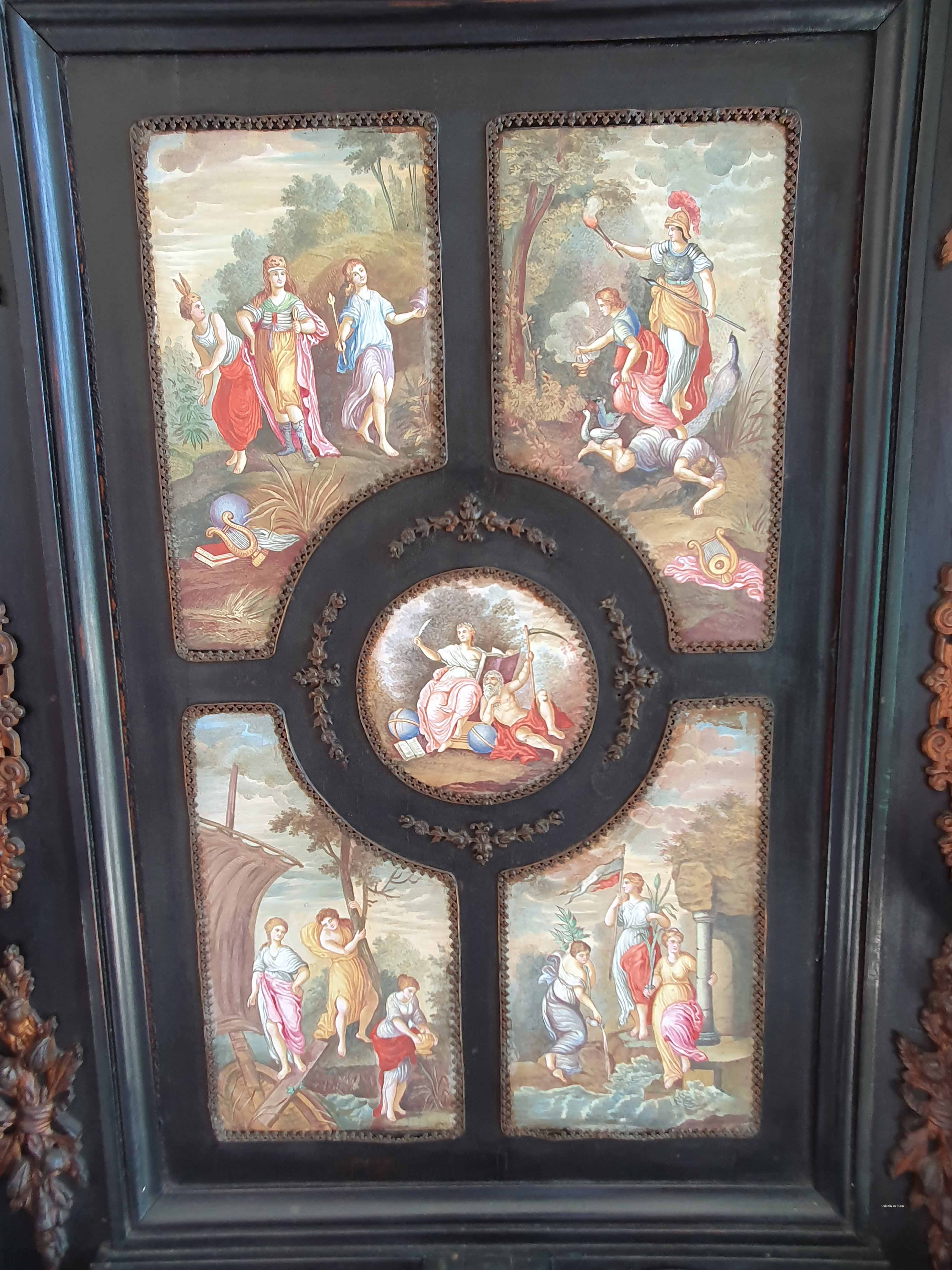 Sierlijke kroonluchters, die ooit van kaarsen voorzien waren, hangen onder zeer hoge plafonds in elke kamer. Kasten met prachtige handgeschilderde afbeeldingen bevatten kwetsbaar porselein en curiosa. Elke kamer vormt een uniek meesterwerk door de kleurrijke muurbehandelingen onder de wandlijsten, rond de deuropeningen en ramen.