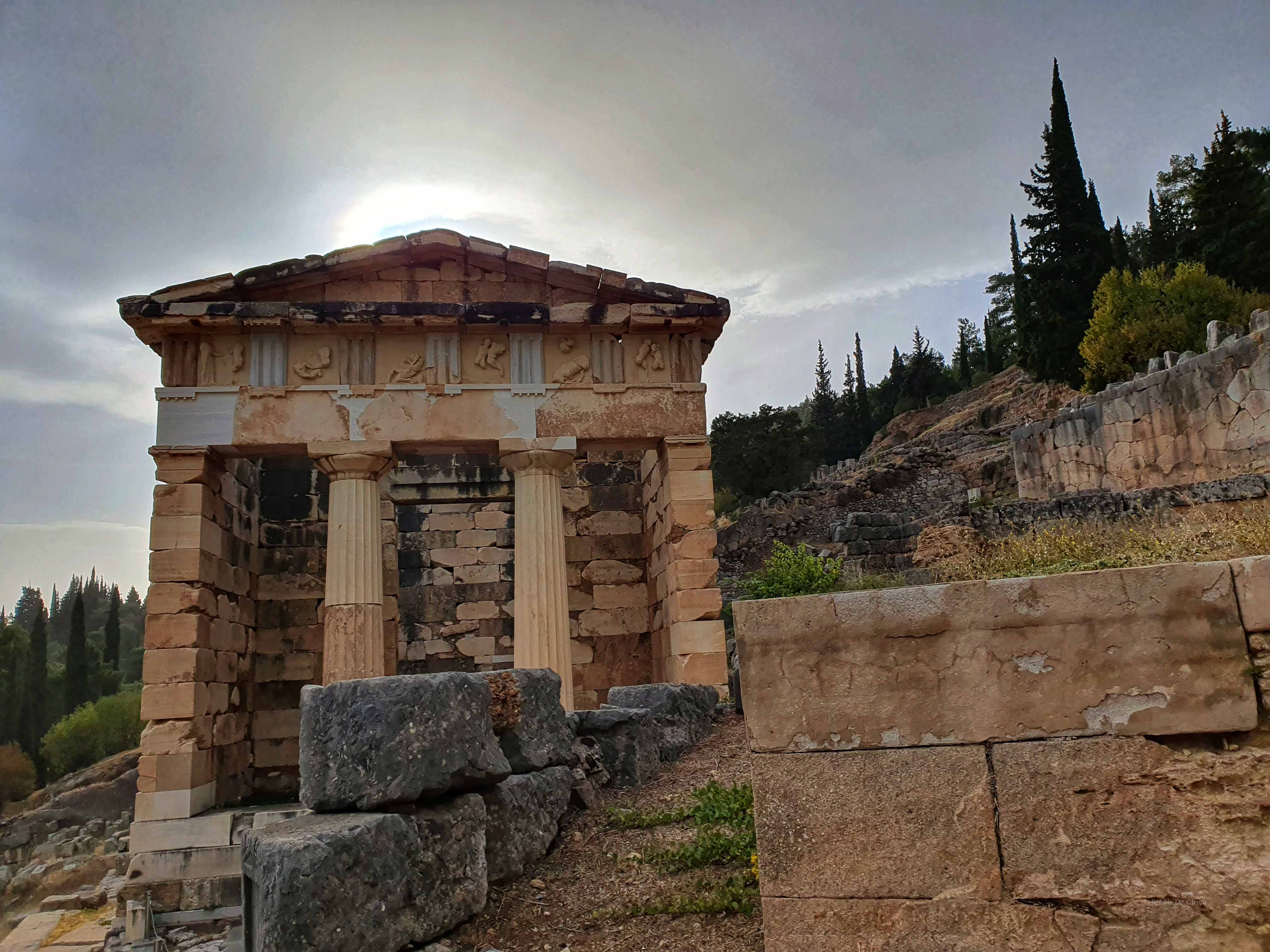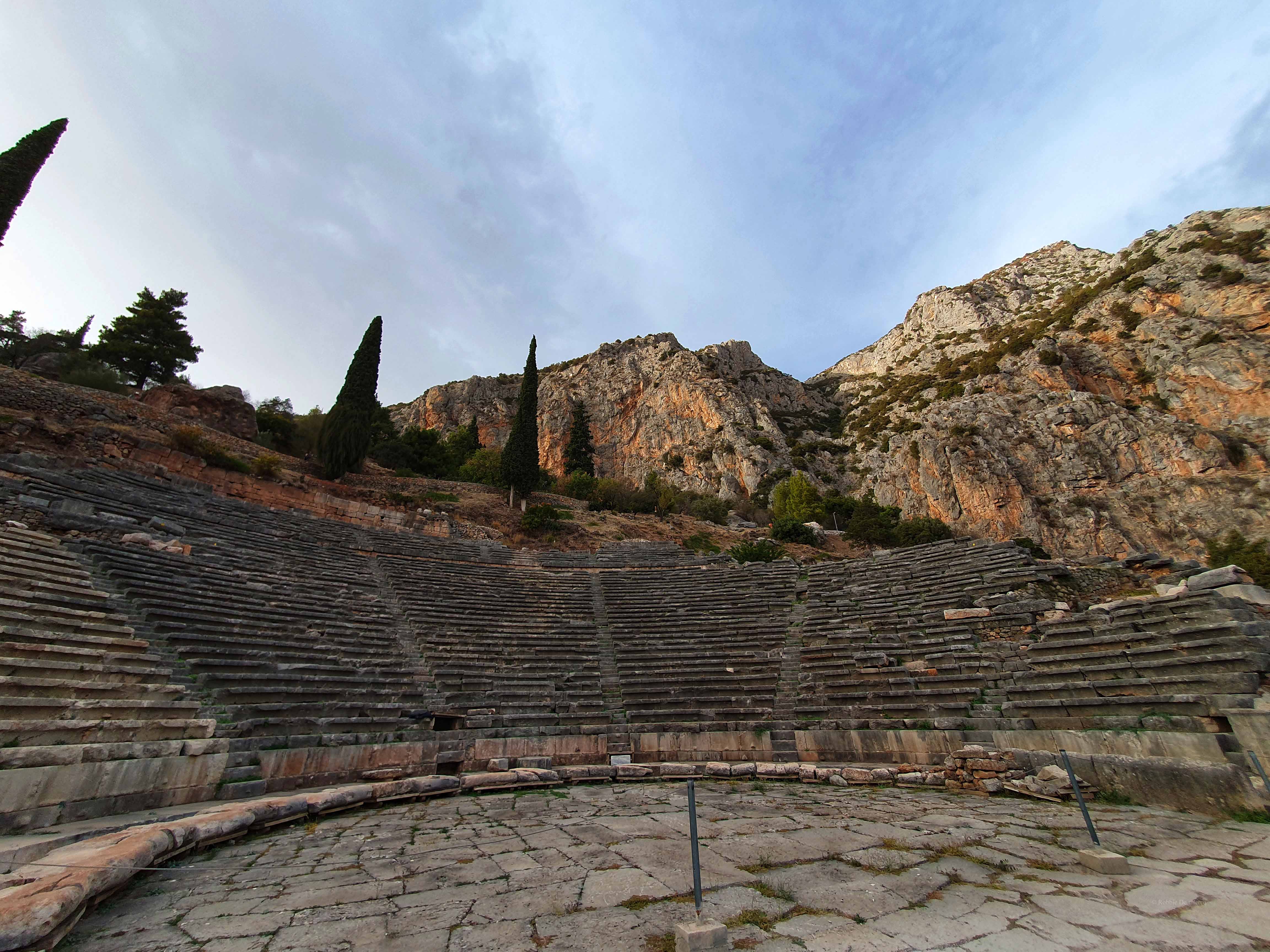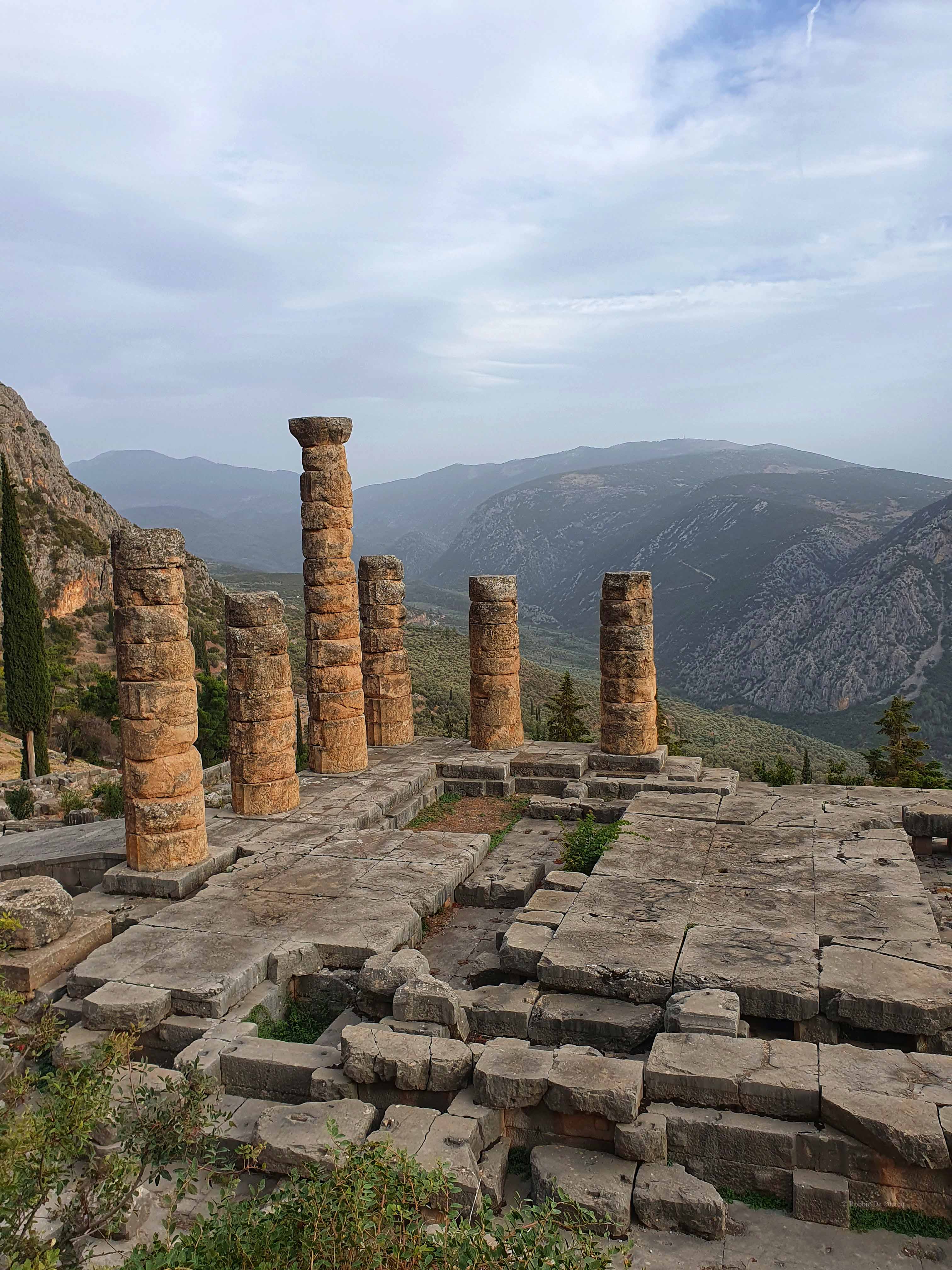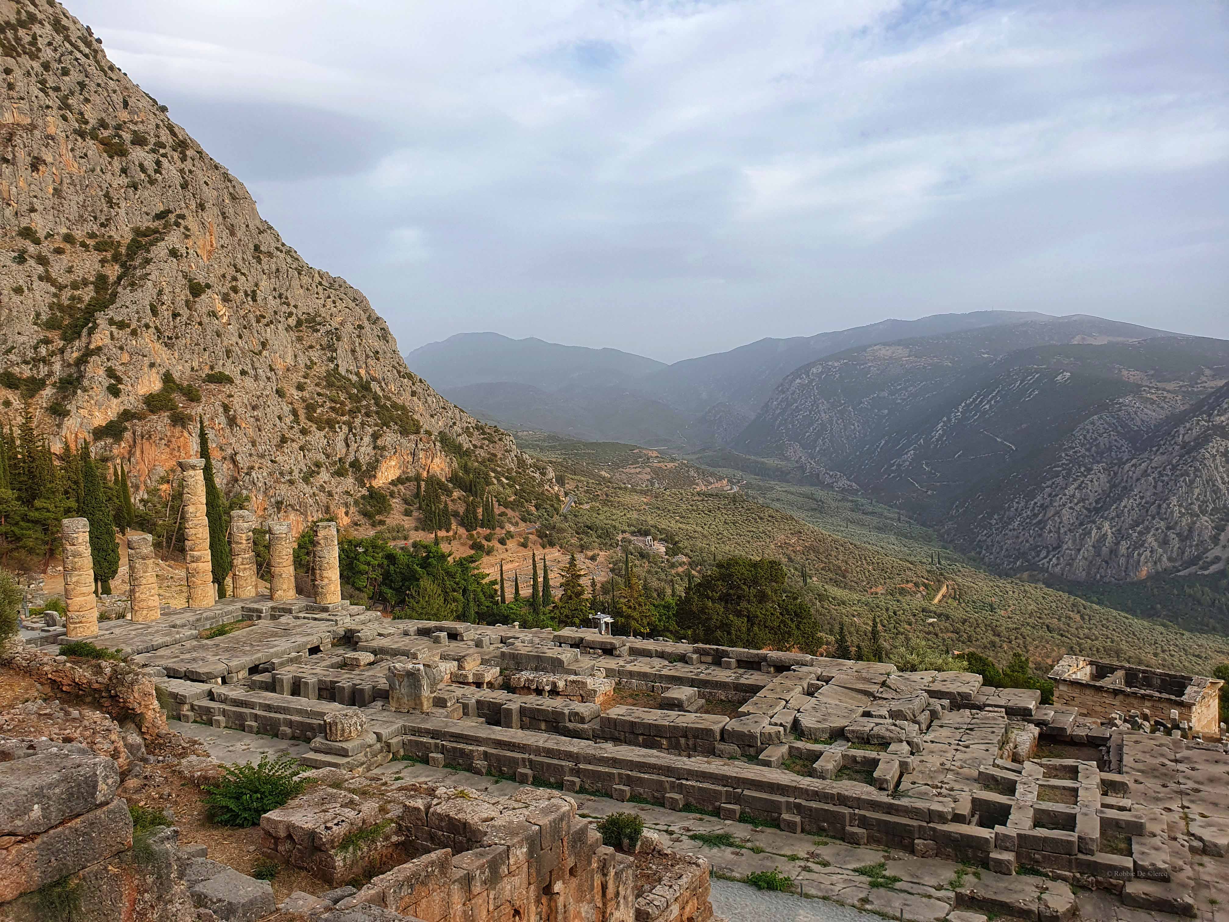 Delphi was voor de oude Grieken zowel letterlijk als figuurlijk het middelpunt, de navel, van de aarde. Volgens de mythologie liet de Griekse oppergod Zeus 2 adelaars vanuit de uithoeken van de aarde opstijgen om zo het middelpunt van zijn rijk vast te stellen. De adelaars zouden elkaar in Delphi zijn tegengekomen op de plek waar in 1913 de omphalós, de bekende navelsteen, werd gevonden.