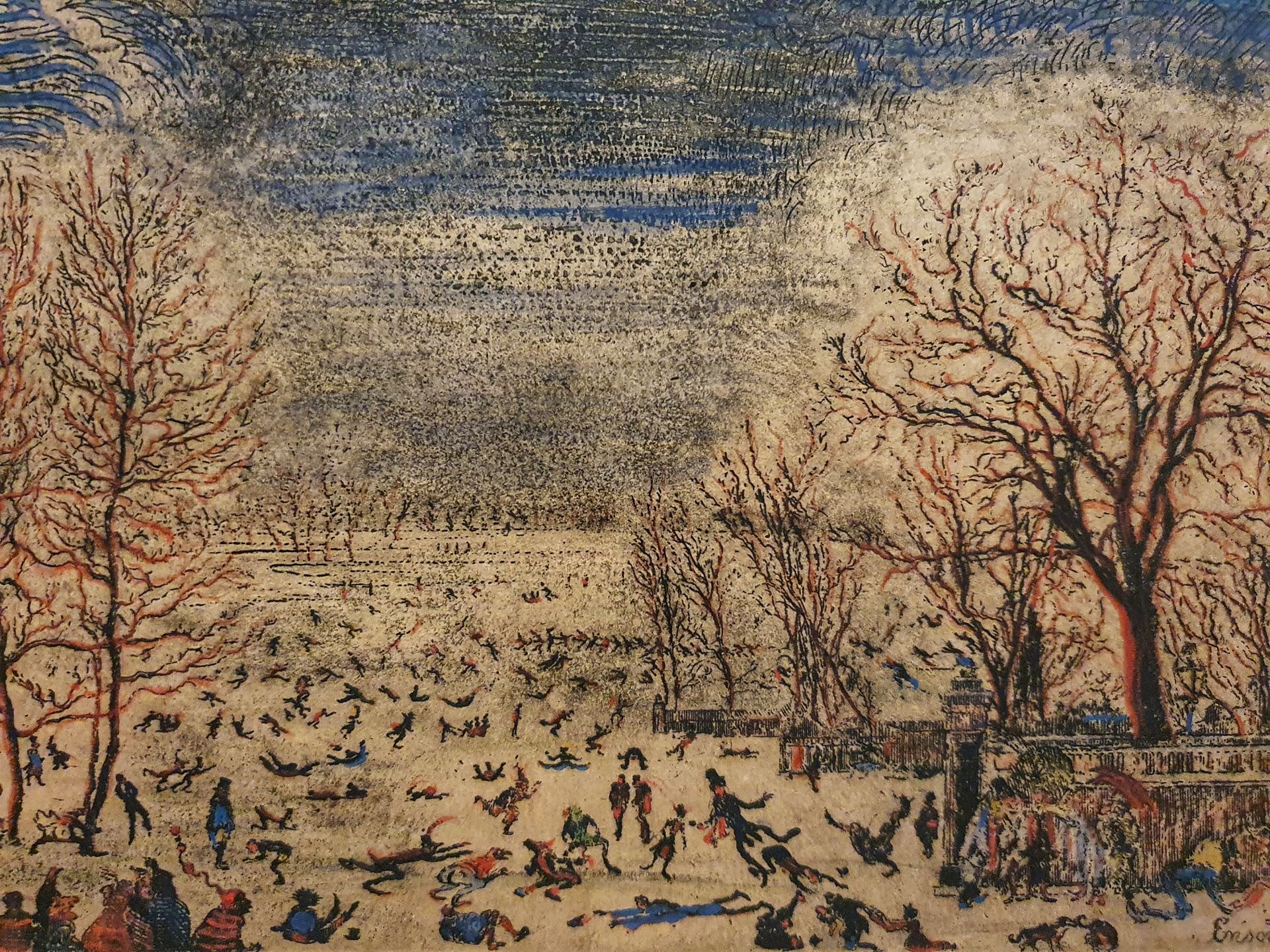 Ensors staten van verbeelding brengt voor het eerst de meest opmerkelijke resultaten van deze experimenten bij elkaar: voorbereidende tekeningen, koperplaten en verschillende staten van prenten. We tonen unieke drukken op perkament en gekleurd satijn. Ensor transformeert afdrukken tot unieke kunstwerken door ze handmatig in te kleuren met kleurpotlood, krijt en waterverf. Zo duiken er onverwachte details op, ontstaat er diepte in grote mensenmassa’s en krijgen nieuwe gestalten vorm.