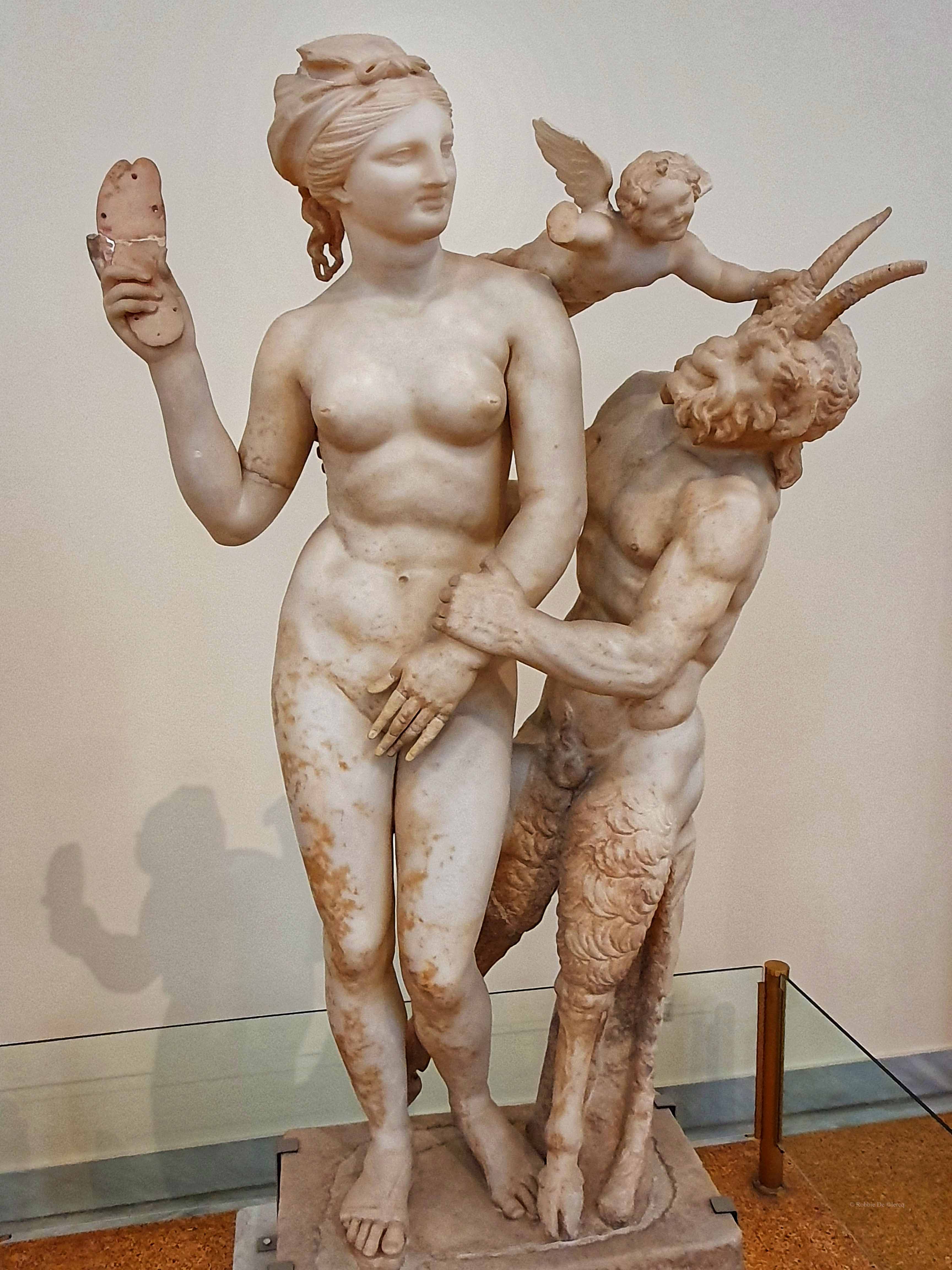 De rechterarm van de godin en het bovenste deel van het hoofd, evenals de benen en de linkerarm van Eros, moesten opnieuw worden vastgemaakt omdat ze waren afgebroken. De rechterarm van Eros ontbreekt. Pan’s rechterbeen en hoorns moesten ook opnieuw worden vastgemaakt. Drie vingers van de linkerhand van Aphrodite en de middelvinger van haar rechterhand werden aangevuld met gips.