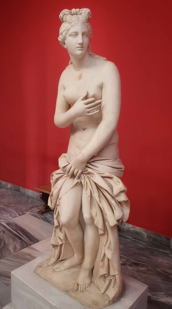 Het beeld werd gerestaureerd door de beeldhouwer Antonio Canova, omdat het aanvankelijk geen hoofd, nek en rechterarm had. Aphrodite wordt grotendeels naakt afgebeeld, met alleen een mantel over haar billen die met haar linkerhand op haar geslachtsdelen wordt gehouden. De rest van het kledingstuk valt achter en naast haar op de grond. De brede stroom stof vervult tevens de functie van standbeeldsteun. De twee voeten staan dicht bij elkaar op een sokkel, waarbij het linkerbeen als steunpoot dient. Met haar rechterhand probeert de godin haar linkerborst te bedekken. Het hoofd is naar links gedraaid. Het beeld is gebaseerd op een beeld van de beroemde beeldhouwer Praxiteles en is een Romeinse kopie van een Grieks origineel.