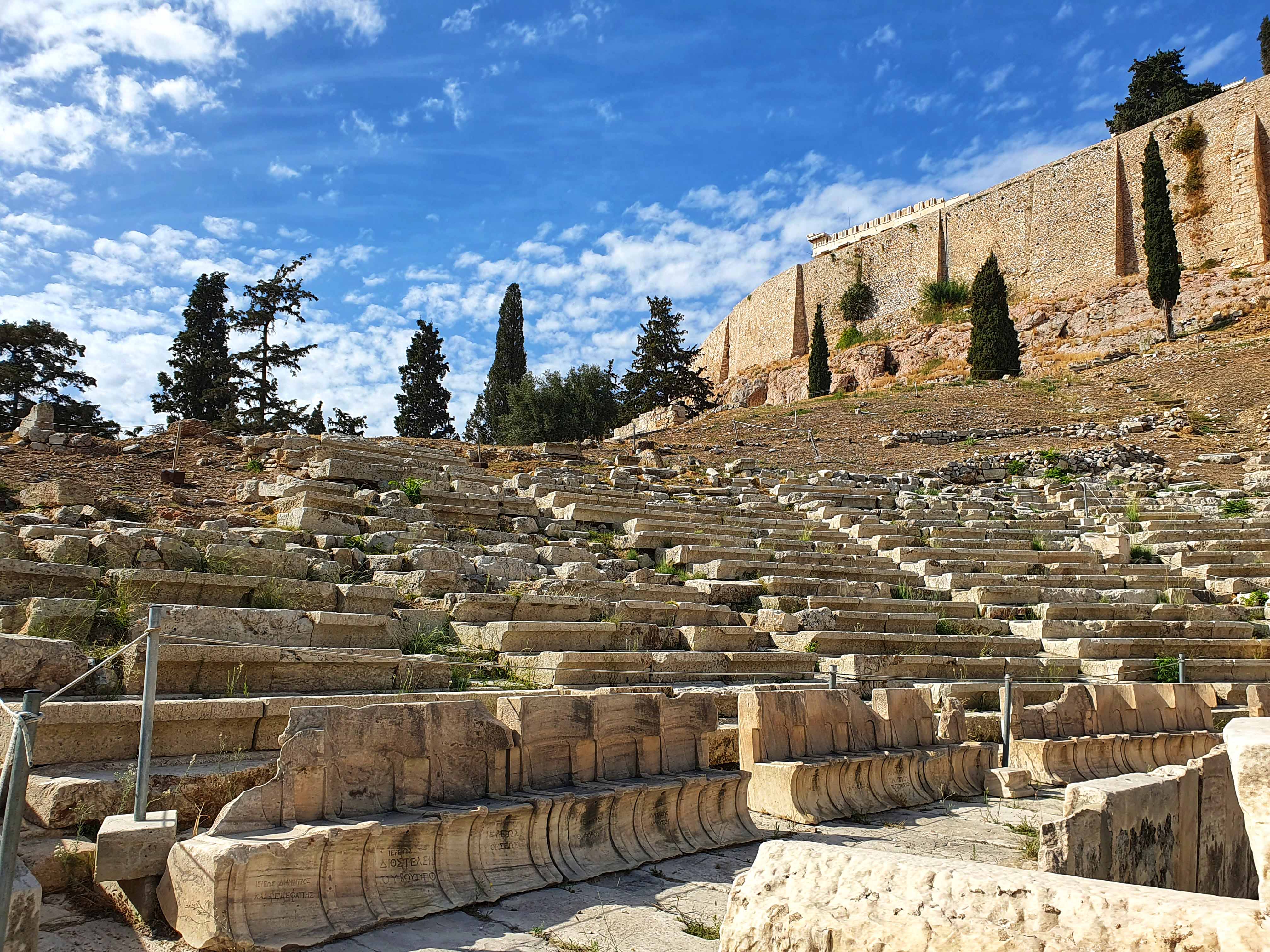 Omdat het Attische drama in de 5e eeuw v.Chr. een snelle ontwikkeling doormaakte en een uniek hoogtepunt bereikte, moesten zowel het podium als de ruimte voor de toeschouwers voortdurend uitgebreid en verbeterd worden. Onder de staatsman Lycurgus, tussen 342 en 326 v.Chr., kreeg het theater zijn definitieve aanzicht, met 67 rijen marmeren zitbanken die plaats boden aan ± 17.000 toeschouwers. In het midden van de eerste rij bevindt zich nog de ereplaats, een met reliëfs versierde zetel, voorbehouden aan de priester van Dionysus Eleutherus.