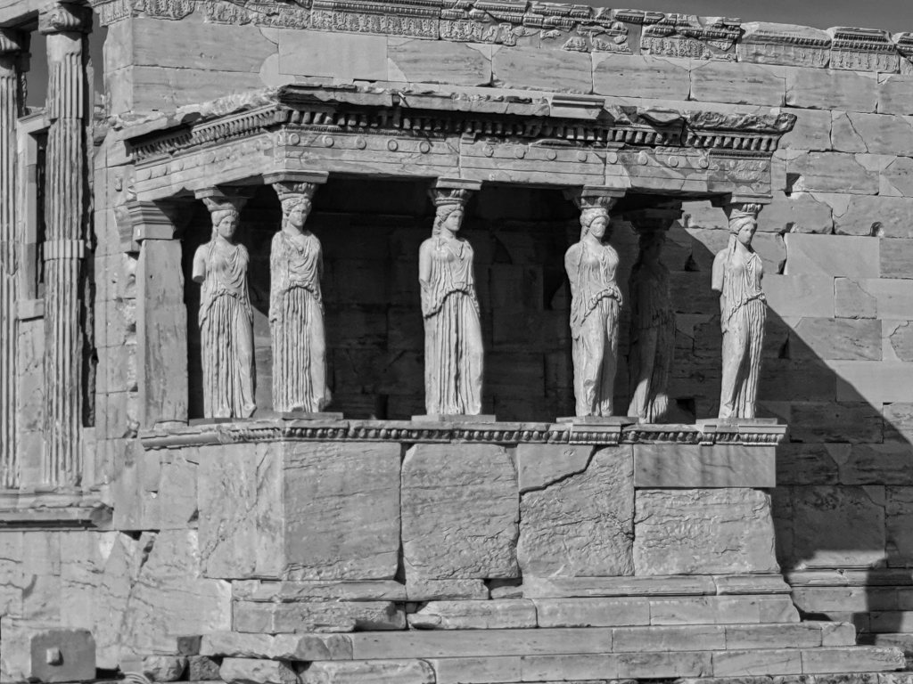 De zuidelijke hal is de zogenaamde kariatidentribune, waarvan de zes zuilen de vorm hebben van 2,3 m hoge vrouwenfiguren wier hoofd als kapiteel dient. Deze “zuilvrouwen” noemt men kariatiden. In 1977 zijn ze vervangen door kopieën. Vijf originele bevinden zich in het nieuwe Akropolismuseum. De andere is, net als vele andere originele Griekse beelden en friezen, te vinden in het Londense British Museum. Gestolen volgens de Griekse overheid, gered van de verwoesting volgens de Britten.