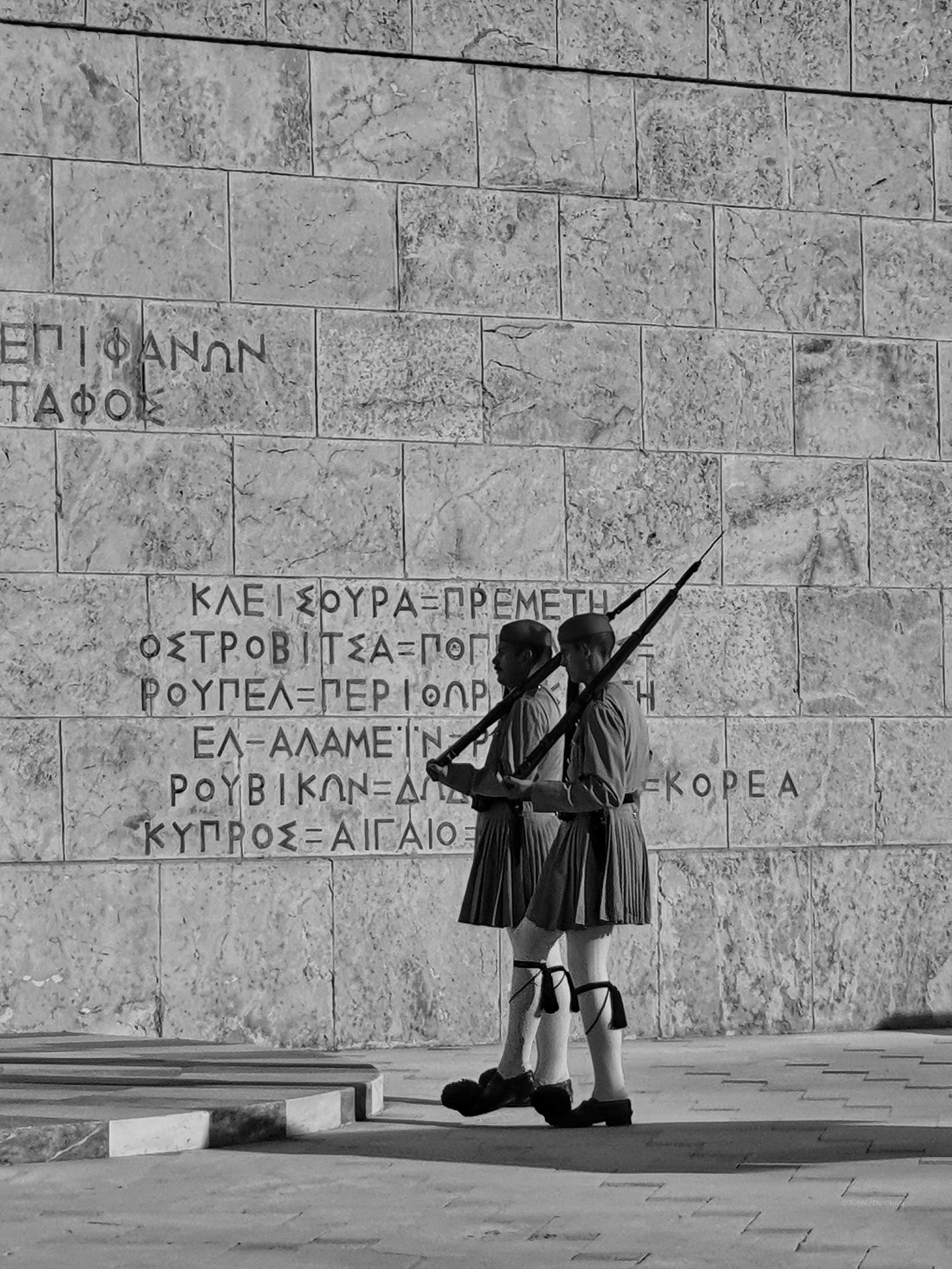 Naast het monument zie je aan beide kanten de beroemde soldaten van de Presidentiele wacht, ook wel Evzones genoemd, die het monument 24 uur per dag bewaken. Ze dragen traditionele klederdracht uit zuid-Griekenland met als belangrijkste kenmerk de rok en speciale schoenen.