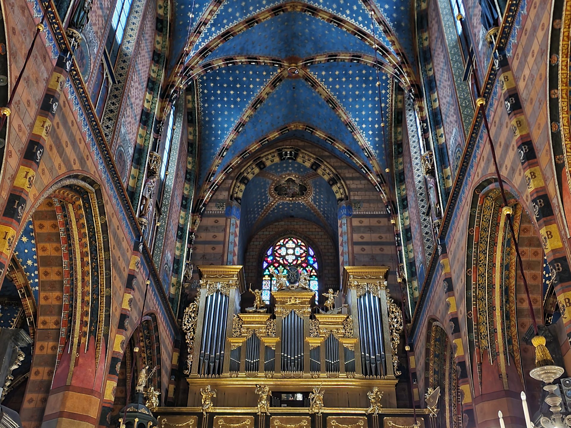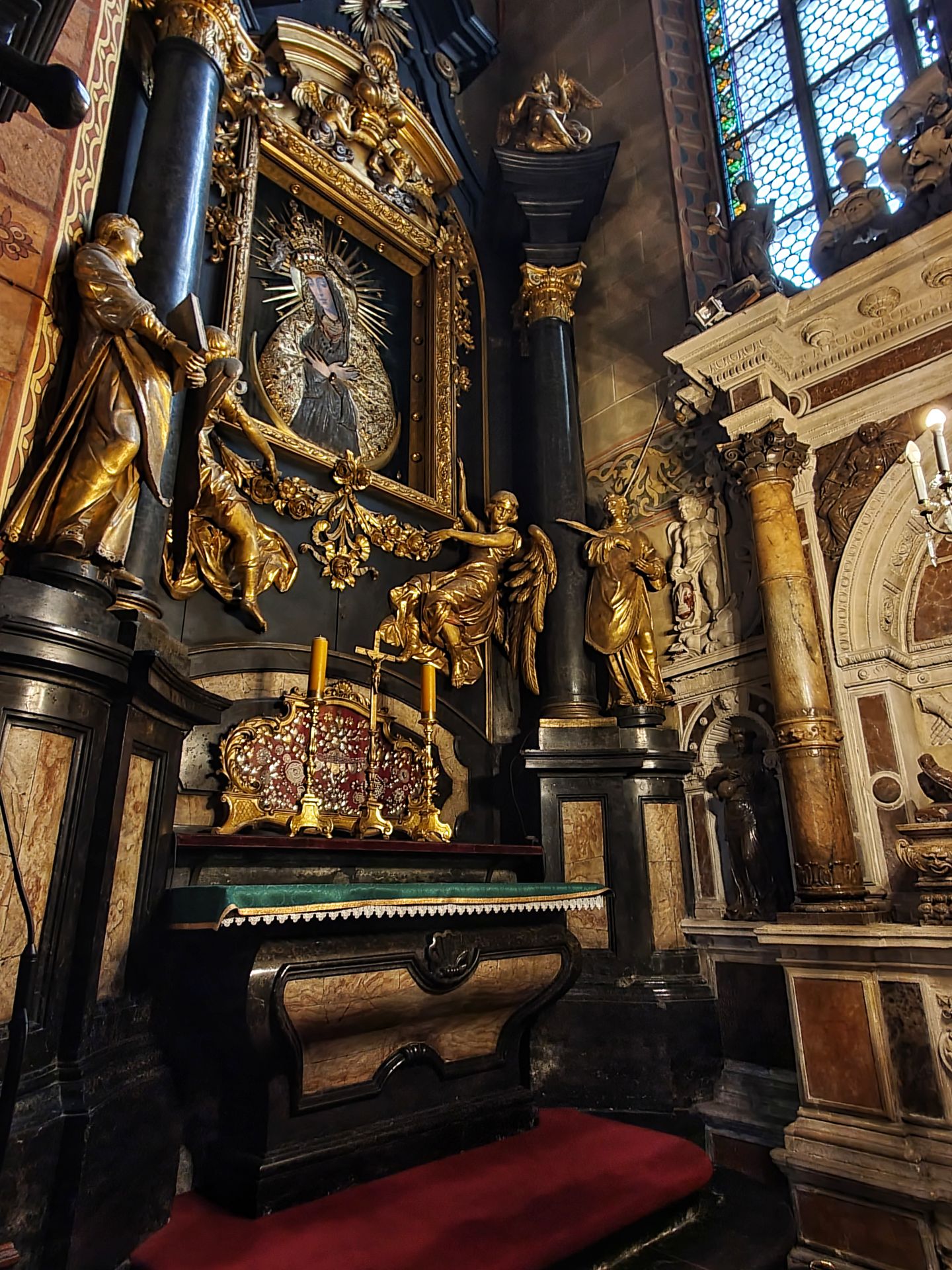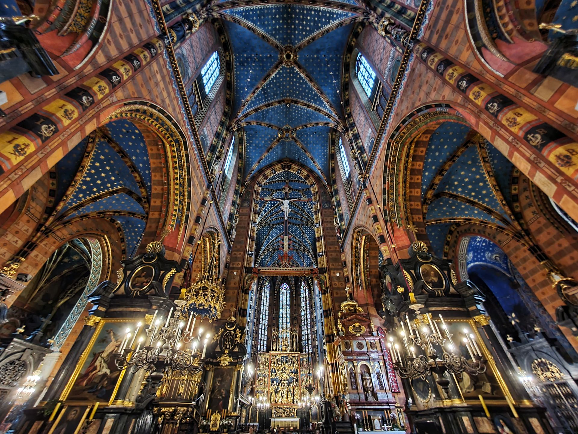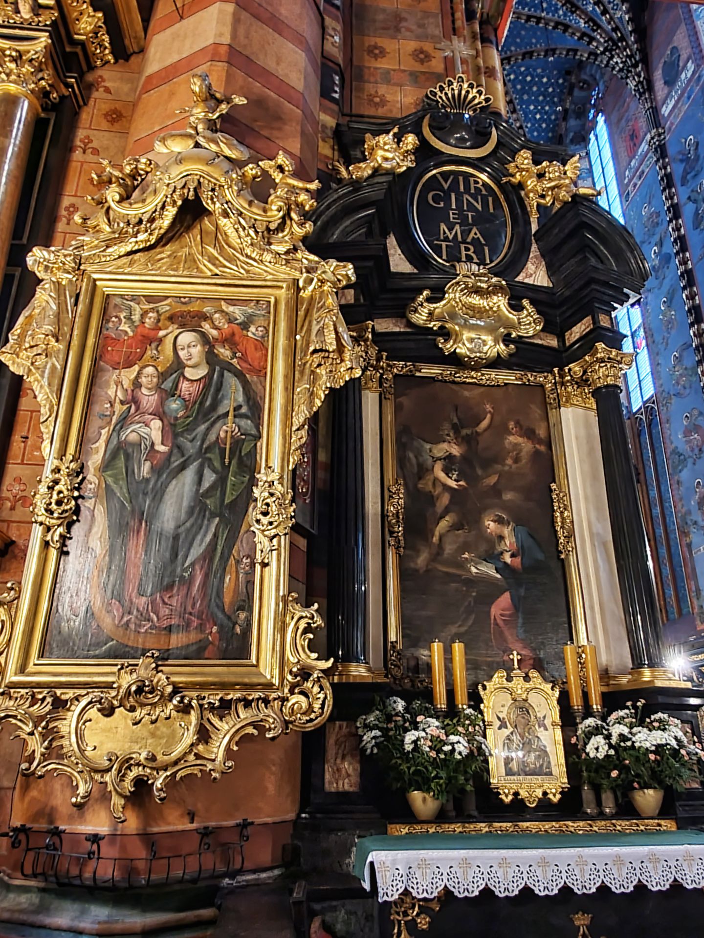 Het belangrijkste kunstwerk betreft het hoogaltaar van Veit Stoss. Het is het grootste altaar van Europa in zijn soort en werd in de jaren 1477-1489 vervaardigd. Het altaar werd mogelijk gemaakt door een schenking van de burgerij van Krakau. Het Maria-altaar heeft een afmeting van 11 meter breed bij 13 meter hoog. De hoogte van de realistisch weergegeven beelden bedraagt circa 2,7 meter. De constructie van het altaar werd van eikenhout gemaakt, de beelden uit lindehout gesneden. In geopende stand worden scènes van de vreugdevolle geheimen van Maria getoond, bij gesloten stand zijn twaalf droevige scènes uit het leven van Maria te zien.