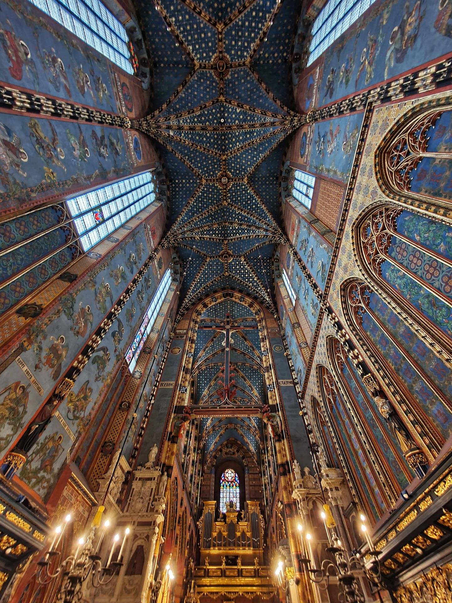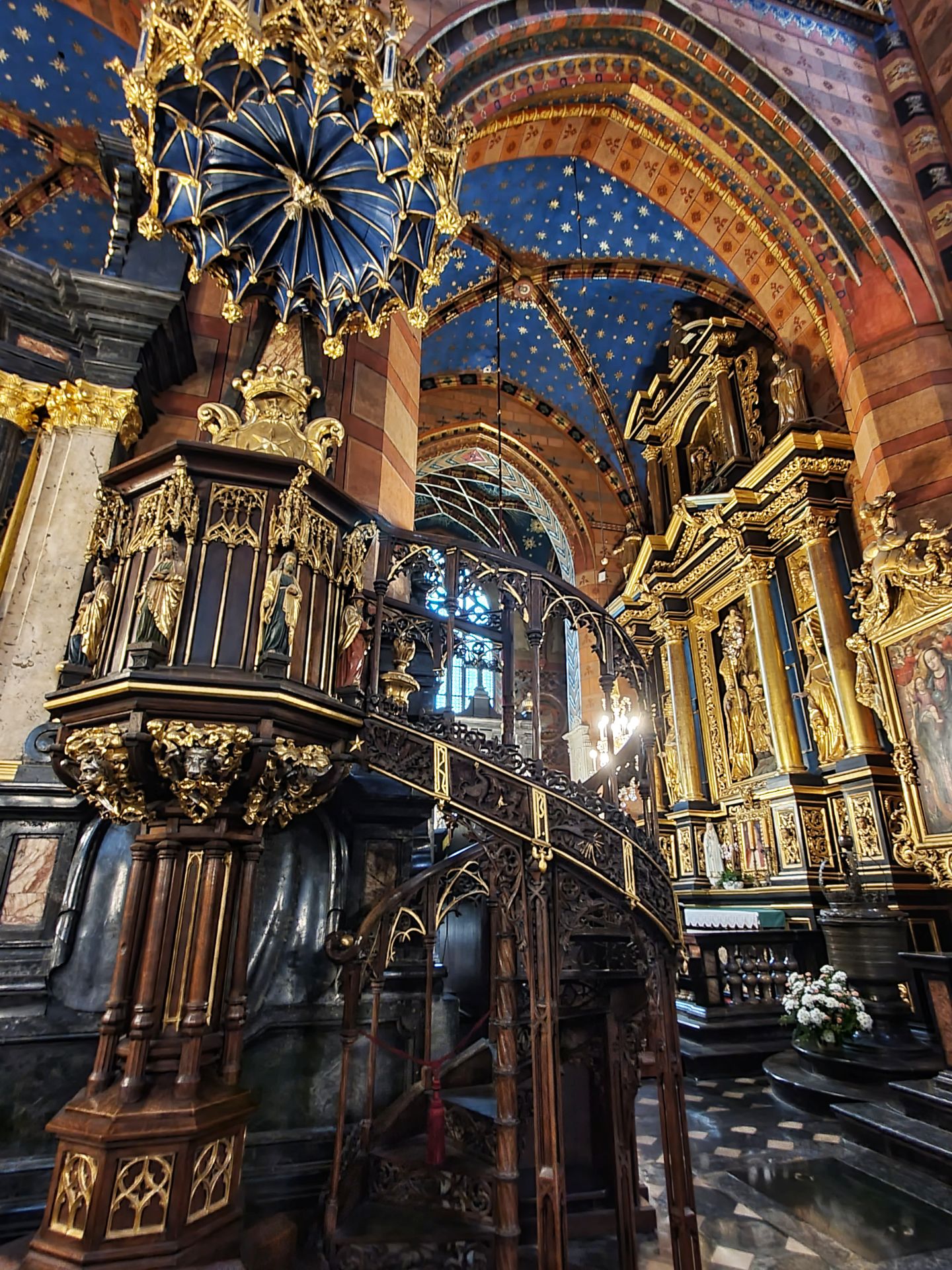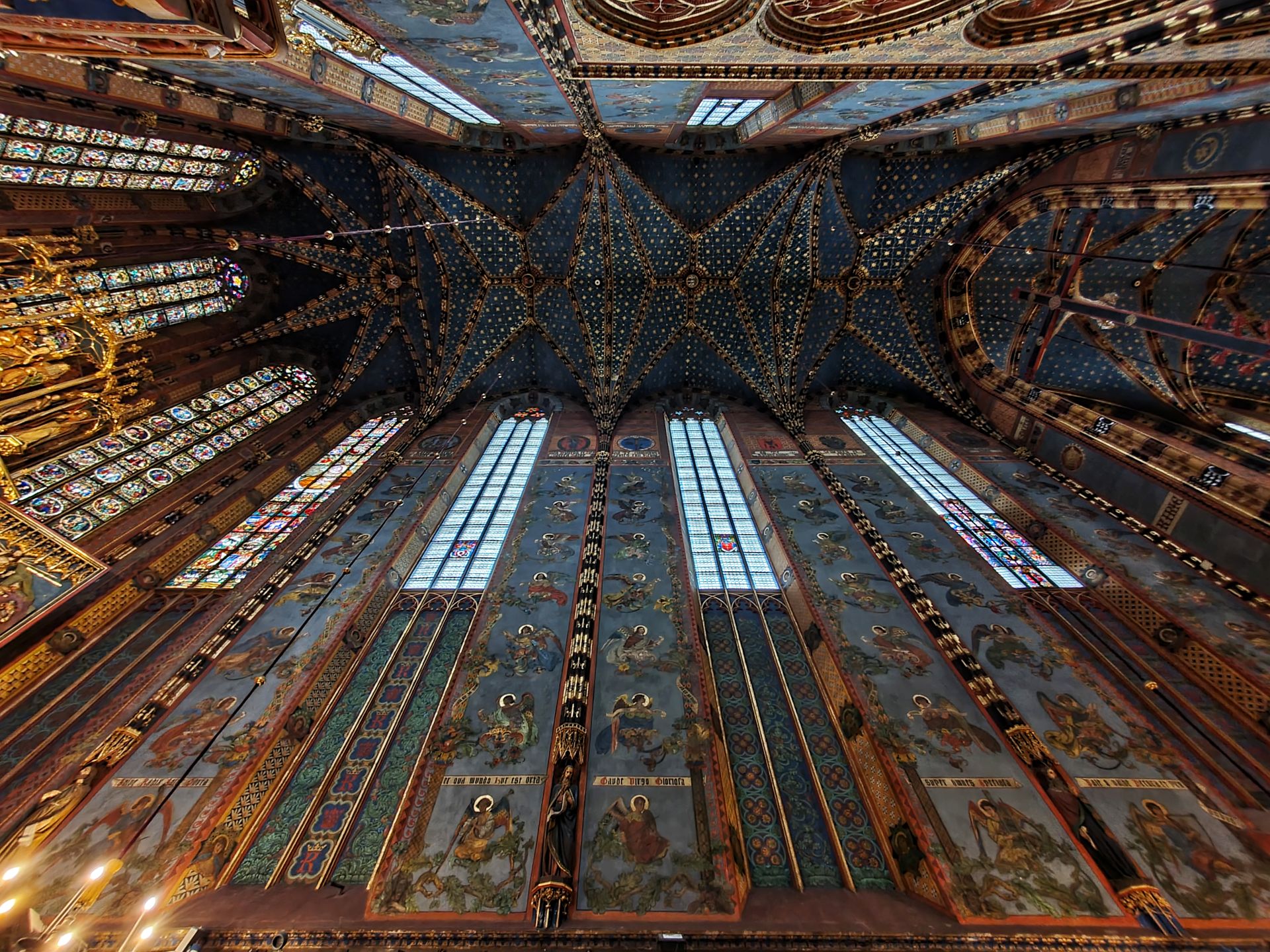 Het belangrijkste kunstwerk betreft het hoogaltaar van Veit Stoss. Het is het grootste altaar van Europa in zijn soort en werd in de jaren 1477-1489 vervaardigd. Het altaar werd mogelijk gemaakt door een schenking van de burgerij van Krakau. Het Maria-altaar heeft een afmeting van 11 meter breed bij 13 meter hoog. De hoogte van de realistisch weergegeven beelden bedraagt circa 2,7 meter. De constructie van het altaar werd van eikenhout gemaakt, de beelden uit lindehout gesneden. In geopende stand worden scènes van de vreugdevolle geheimen van Maria getoond, bij gesloten stand zijn twaalf droevige scènes uit het leven van Maria te zien.