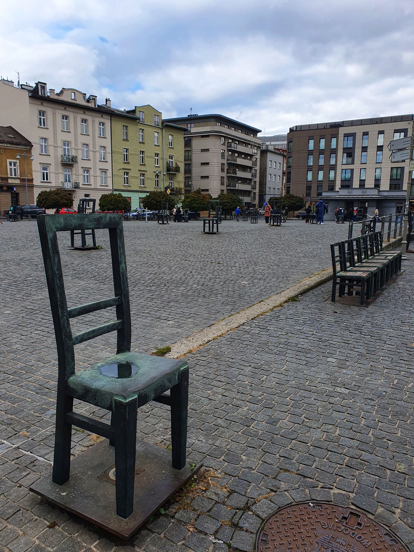 Het Heldenplein was vroeger het middelpunt van het getto. Het monument van lege stoelen, verspreid over het plein, staat symbool voor de leegte die achterbleef na de definitieve ontruiming in maart 1943.
