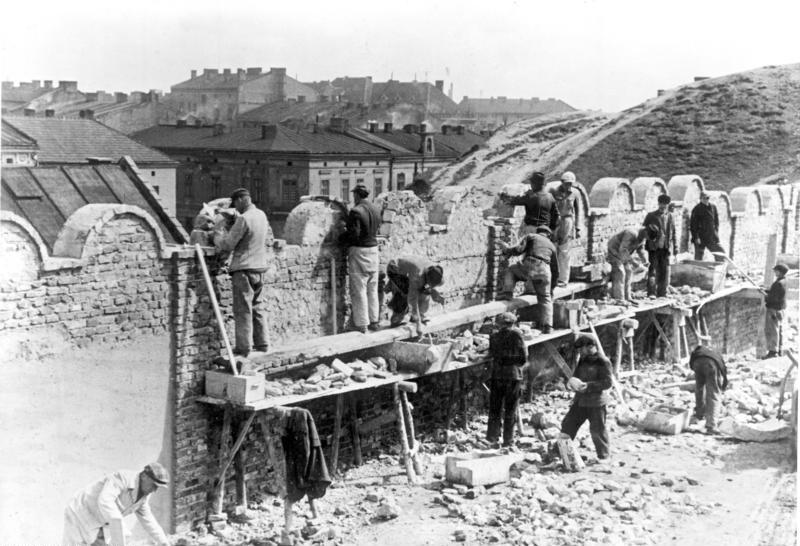 Het getto werd omringd door de nieuw gebouwde muren die het gescheiden hielden van de rest van de stad. In een grimmige voorbode van de nabije toekomst bevatten deze muren bakstenen panelen in de vorm van grafstenen. Alle ramen en deuren die naar de “Arische” kant kwamen, moesten worden dichtgemetseld. Slechts vier bewaakte ingangen lieten het verkeer in of uit. Kleine delen van de muur zijn er nog steeds, een deel is voorzien van een gedenkplaat met de tekst: “Hier leefden, leden en kwamen ze om door toedoen van Hitlers beulen. Van hieruit begonnen ze aan hun laatste reis naar de vernietigingskampen.”