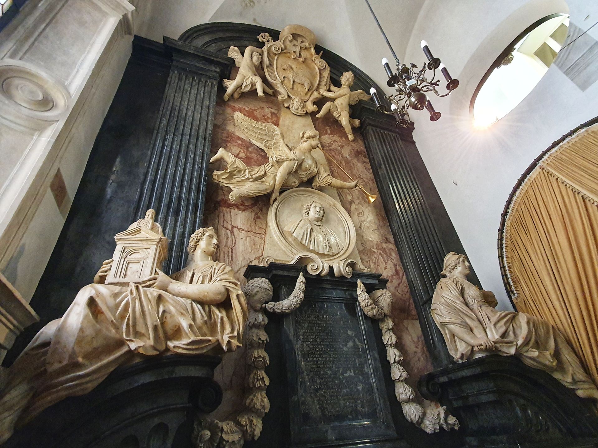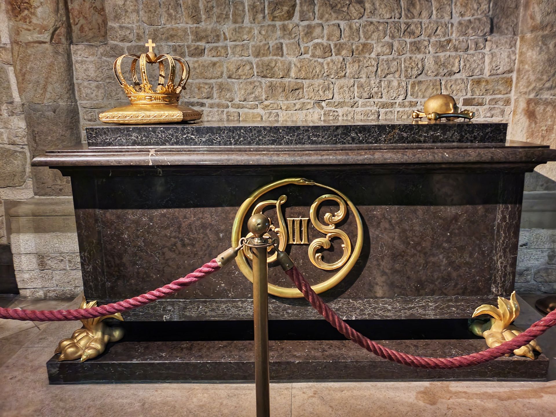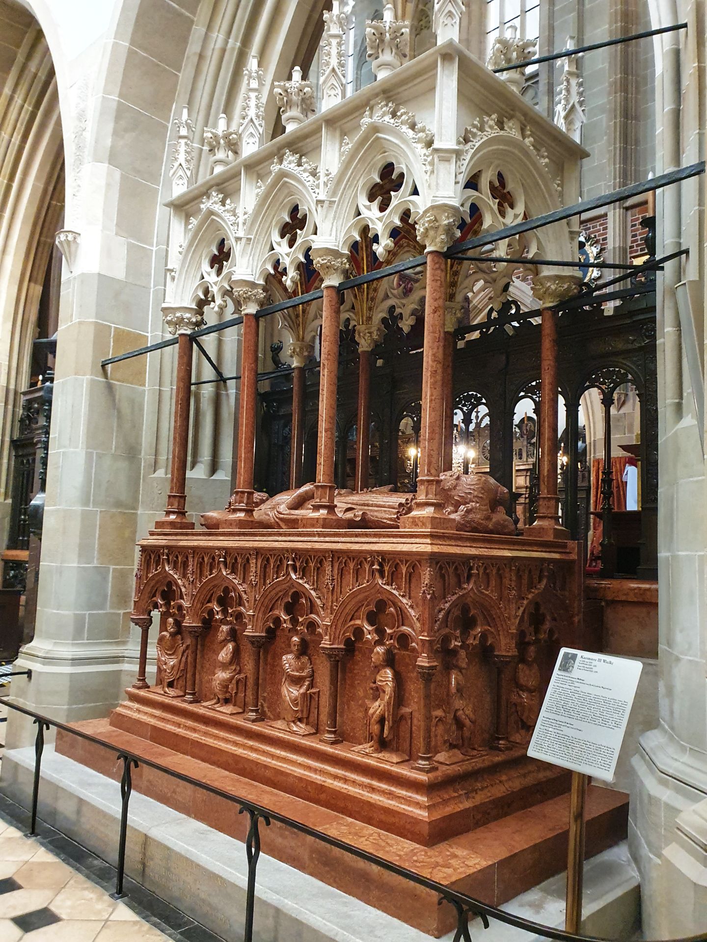 Het witte grafmonument van carraramarmer voor de heilige koningin Hedwig bevindt zich tussen de pilaren in het midden van de zuidelijke beuk.