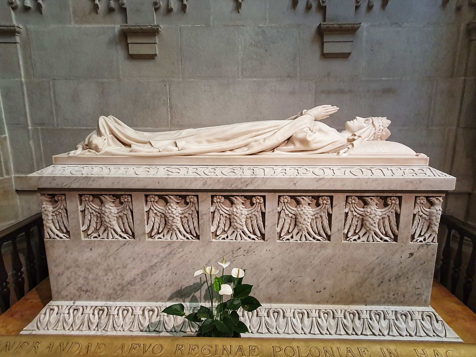 Het witte grafmonument van carraramarmer voor de heilige koningin Hedwig bevindt zich tussen de pilaren in het midden van de zuidelijke beuk.