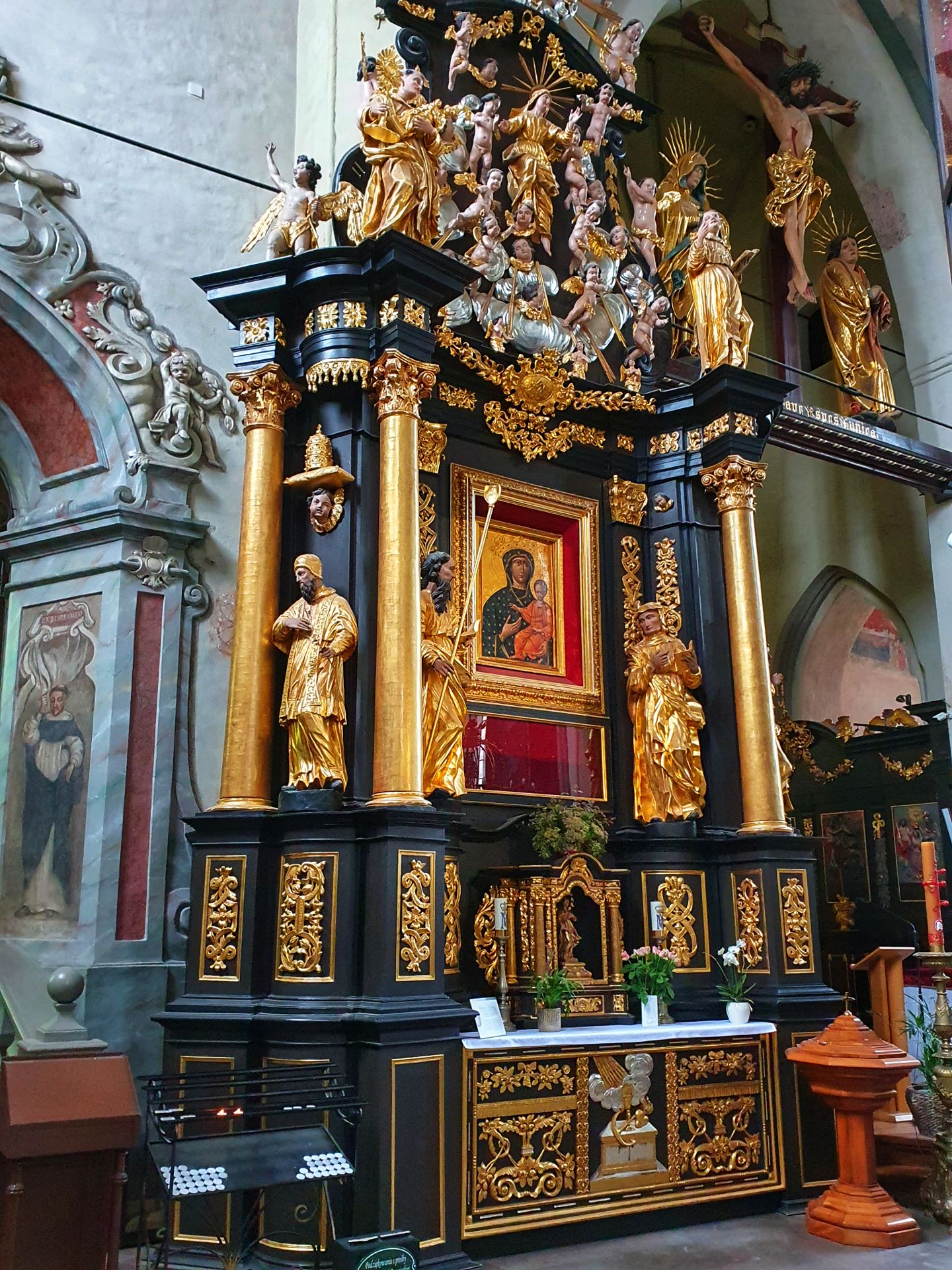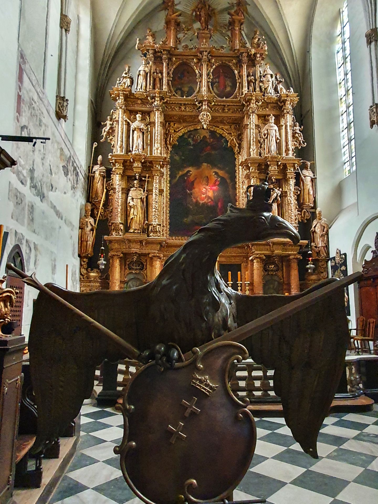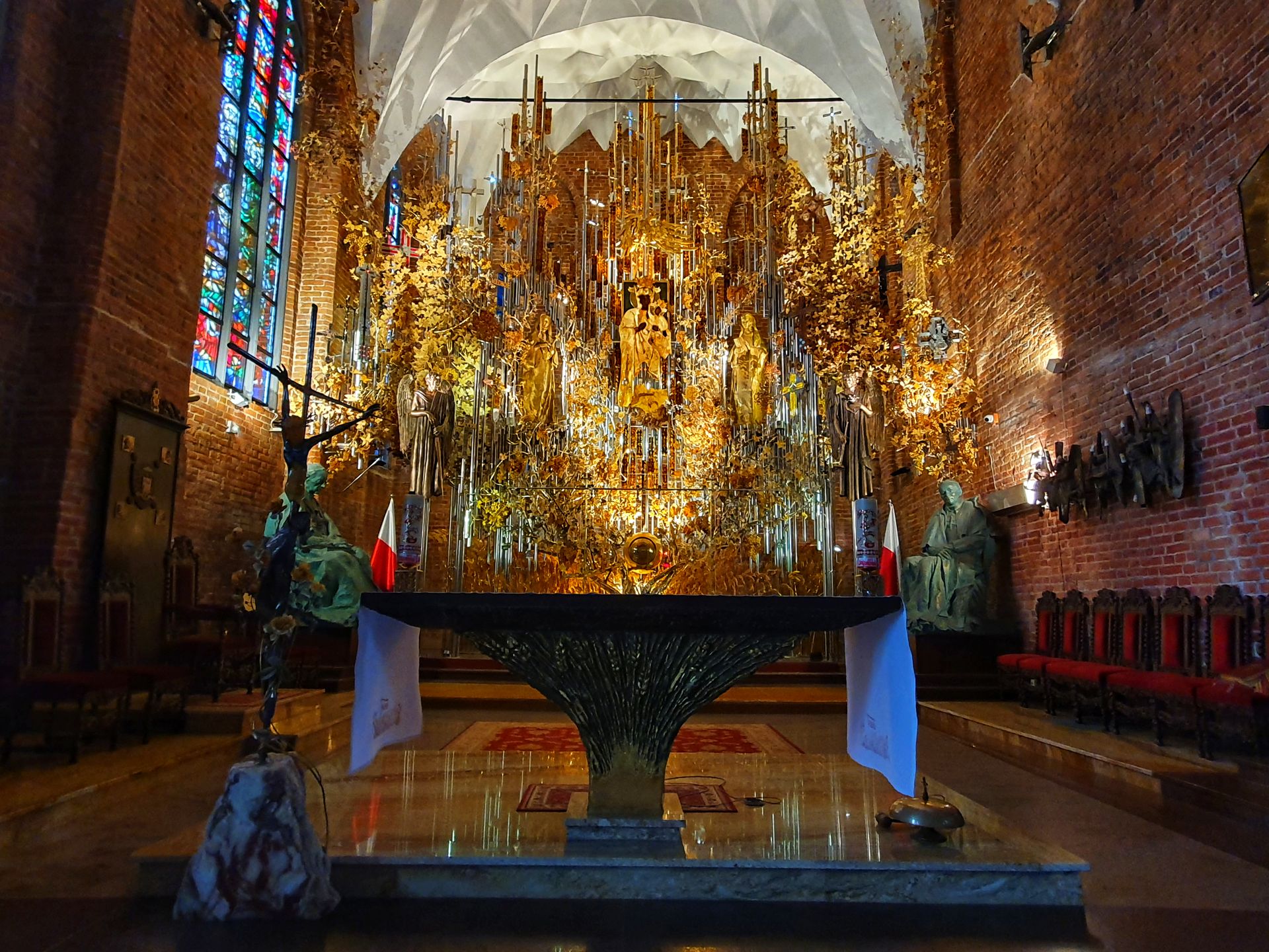 Andere barnsteen-gebeeldhouwde stukken zijn voorzien van het embleem van Polen, gedenktekens voor het Sovjet-bloedbad van Poolse officieren in Katyń en kruisen die werden gebruikt tijdens de stakingen van Solidarność. Het altaar is een van ’s werelds grootste barnsteenprojecten.