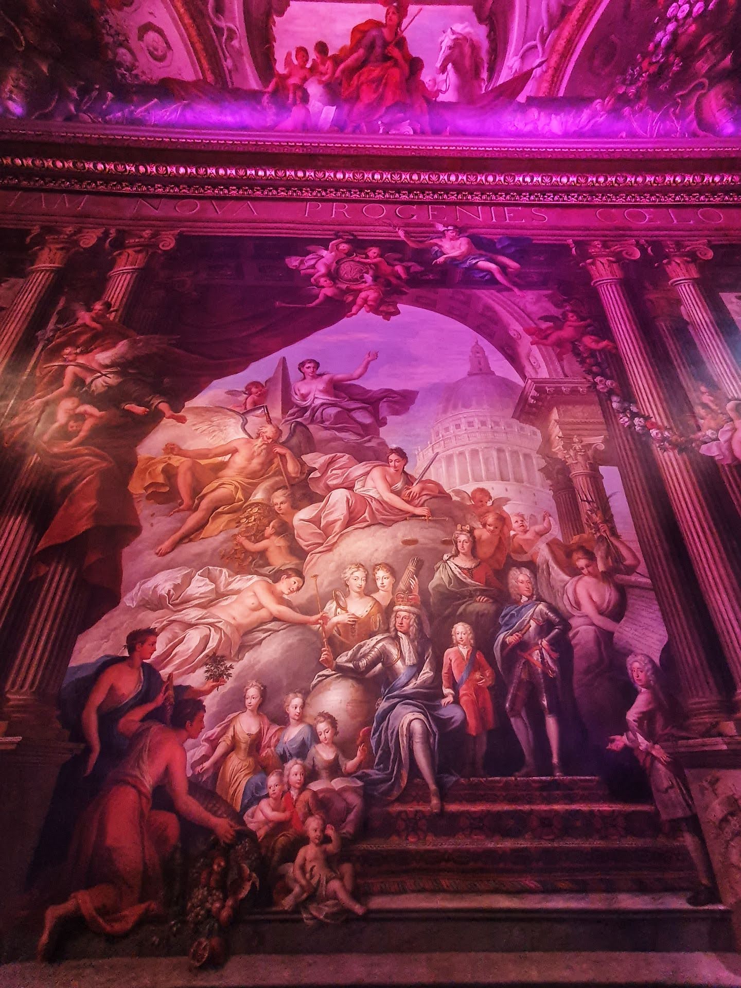 Het schilderwerk is rijk aan kleuren, ingewikkelde details en een dramatisch gebruik van perspectief dat de ruimte optisch vergroot. Naast de visuele pracht heeft de Painted Hall een belangrijke historische rol: het diende als decor voor staatsceremonies, ontvangsten en belangrijke evenementen, waaronder de viering van koninklijke huwelijken en jubilea.